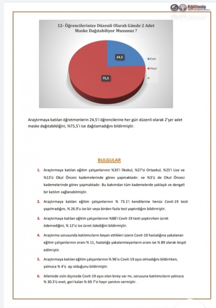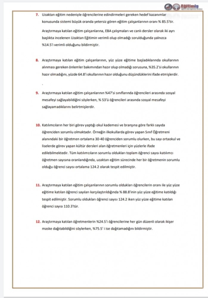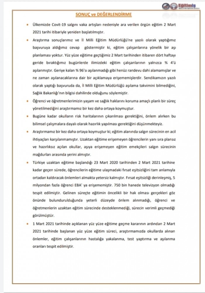 • Öğrenci ve öğretmenlerimizin yaşam ve sağlık haklarını koruma amaçlı planlı bir süreç yönetilmediğini araştırmamız bir kez daha ortaya koymuştur.