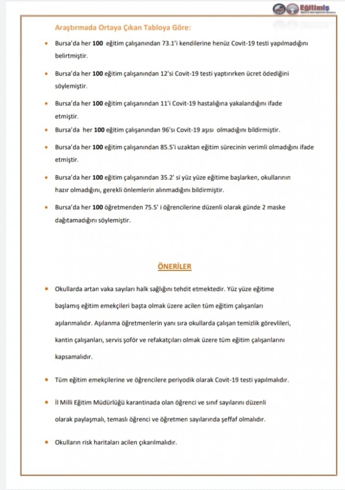 • Bursa’da her 100 eğitim çalışanından 11’i Covit-19 hastalığına yakalandığını ifade etmiştir.