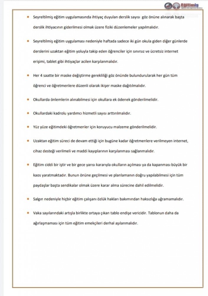 • Uzaktan eğitim süreci de devam ettiği için bugüne kadar öğretmenlere verilmeyen internet, cihaz desteği verilmeli ve maddi kayıplarının karşılanması sağlanmalıdır.
