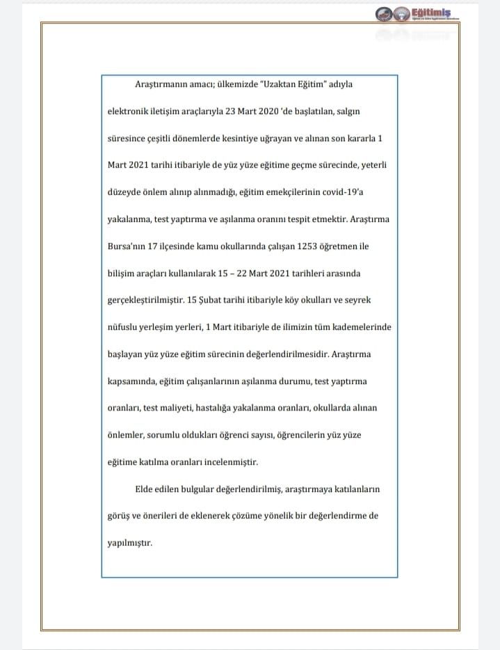 Araştırmanın amacı; ülkemizde “Uzaktan Eğitim” adıyla elektronik iletişim araçlarıyla 23 Mart 2020 ‘de başlatılan, salgın süresince çeşitli dönemlerde kesintiye uğrayan ve alınan son kararla 1 Mart 2021 tarihi itibariyle de yüz yüze eğitime geçme sürecinde, yeterli düzeyde önlem alınıp alınmadığı, eğitim emekçilerinin covid-19’a yakalanma, test yaptırma ve aşılanma oranını tespit etmektir. Araştırma Bursa’nın 17 ilçesinde kamu okullarında çalışan 1253 öğretmen ile bilişim araçları kullanılarak 15 – 22 Mart 2021 tarihleri arasında gerçekleştirilmiştir.