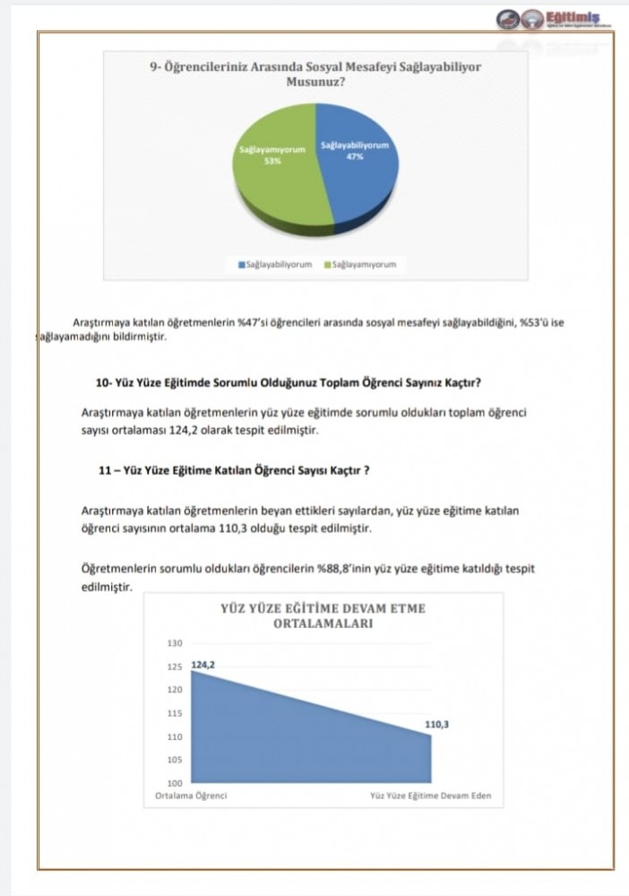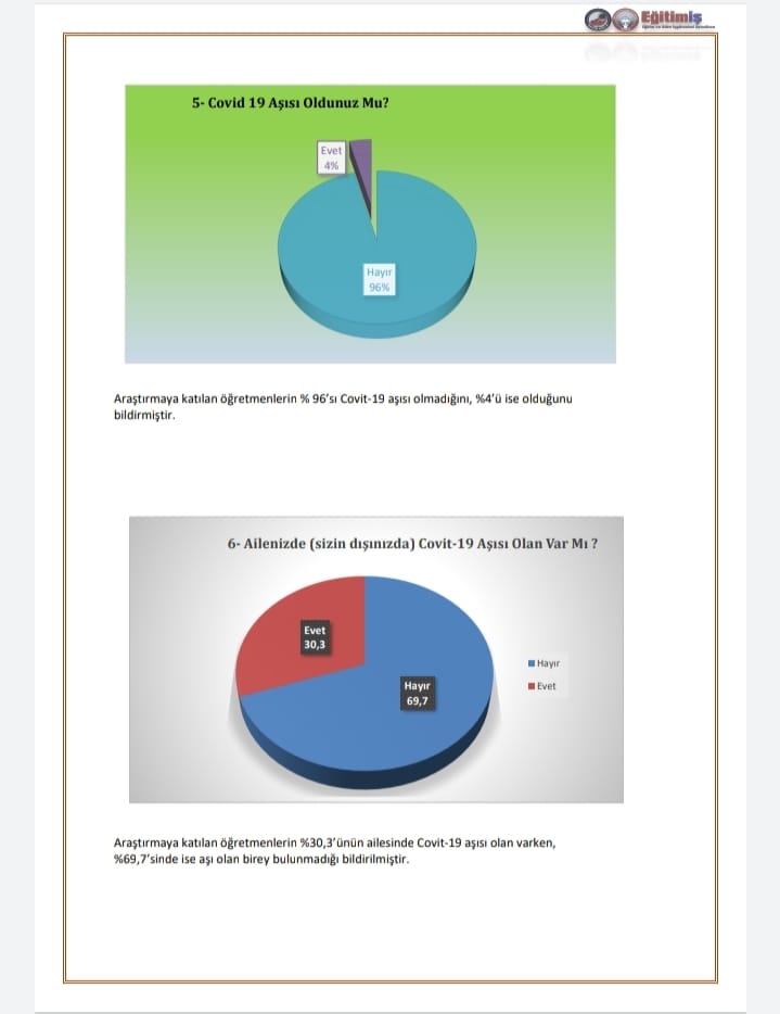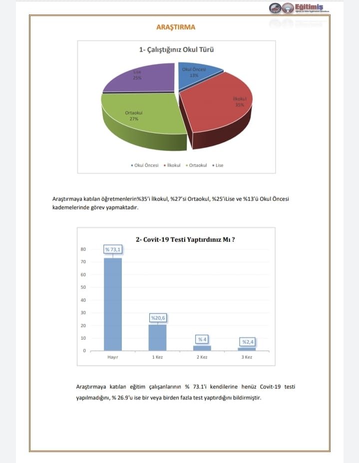• 1 Mart 2021 tarihinde açıklanan yüz yüze eğitime geçme kararının ardından 2 Mart 2021 tarihinde başlanan yüz yüze eğitim süreci, araştırmamızda okullarda alınan önlemler, eğitim çalışanlarının hastalığa yakalanma, test yaptırma ve aşılanma oranları tespit edilmiştir.